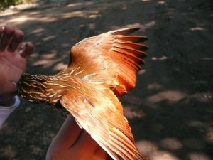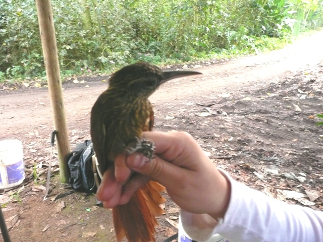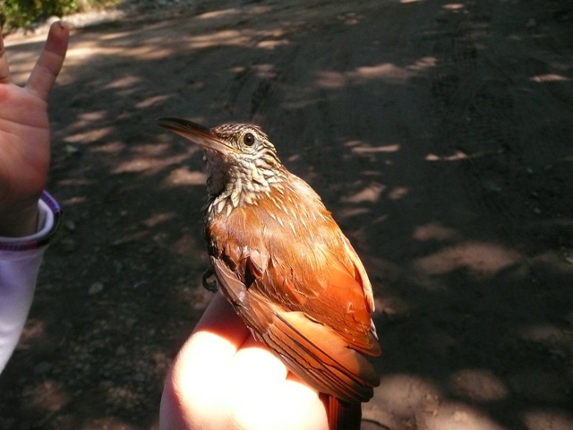 What a shock then, in my first week of bird-banding at CATIE, to have both species right in front of my nose within an hour of each other. At the same time, however, what a fantastic opportunity to make a direct comparison, and I was even able to take photos for posterity (my grandchildren). The Spot-crowned was the first to blunder into the net, and of course I immediately pronounced it a Streak-headed woodcreeper. After all, the CATIE grounds are located at about 650 m, below even the wildest estimates of the bird guides for the range of the Spot-crowned. I was wrong of course, but the appearance of the Spot-crowned was no surprise to Alejandra, who is in charge of the CATIE monitoring programme. Careful observation and measurement of the bird in hand confirmed it as the Spot-crowned, and I’m happy to report that, even though it has streaks all over the place, the marks on the head really are spots and not streaks.