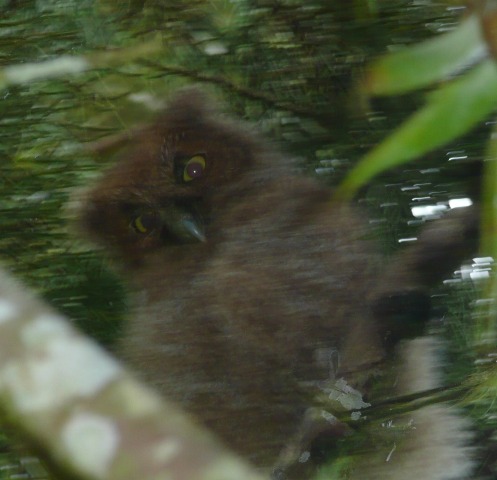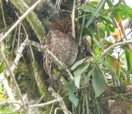 A little while later, I discovered a day roost of the same owl species in a tree heavily laden with epiphytes quite close to the house. Since then, I can regularly visit the tree in the daytime and often find the bird roosting in exactly the same location. Here’s the best photo I have managed so far.