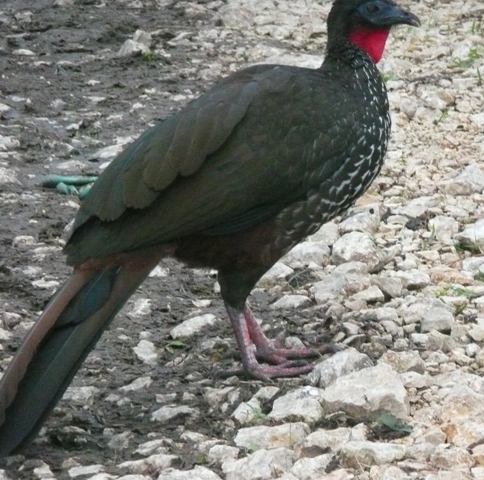 Well, I mention the procession chiefly because, when it ended (with the inevitable crucifixion, of course), friend Fabio took me to a local dairy where the owner has some birds in cages. Apart from some grassquits and seed-eaters (White-collared (Sporophila torqueola) included though no longer found around San Antonio, probably because of being caught for cages), the main interest was a pava (Crested guan (Penelope purpurascens) which had been found in emaciated condition near Peralta. It was in a pen, but, according to the owner, runs free during most of the day, always returning faithfully in the evening. He claims the bird is a female, thinking that the male is black and crested, so he is clearly confusing pavas with pavones (Great curassow (Crax rubra)). It is a very handsome bird, at all events, and I shall return very soon for a photo shoot. Here’s the Crested guan, minus the crest because of the camera-man!