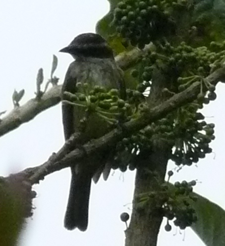 Although I did enjoy the views of the guan, parakeets, seed-eaters et alia (Rotherham Grammar School Latin, this time), today was a better day than yesterday because of the Piratic flycatcher that has caused me to write this post. I’m a compulsive lister, and this one, besides being a lifer, made number 115 on my house list. He (or she) was calling loudly and very distinctively from the top of the fruta de paloma that seems to attract so many species. With only the sky as background, I couldn’t get a really great view, but it looks like a small version of the Sulphur-bellied flycatcher (Myodynastes luteiventris) but without any rufous in the tail. The black through the eye was noticeable, but I could see barely a trace of yellow below. I’d be interested to know if it’s thinking of nesting here (I saw only a single individual), so that I can observe its piratic behaviour. It is said to boot other species out of their nests, either before they lay their eggs or even afterwards. It arrives here in Costa Rica in January and stays until October, then returning to South America for three months or so.