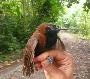 This week’s bird-banding at CATIE, Turrialba, was the first in a while for me. The location was Cacao, which is pretty heavily forested and always seems to yield a few surprises. Today brought two birds that were new to me, the Northern bentbill (Oncostoma cinereigulare), a tiny flycatcher that became an instant favourite of mine, and the Kentucky warbler (Oporornis formosus) , well-known in the Eastern U.S. We also had another Long-billed gnatwren (Ramphocaenus melanurus) who was quite vocal about his capture. This time I managed to get a decent photo at last, and so I include it.