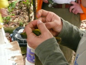 The Kentucky warbler has a classically beautiful look that at first may bring to mind the Common yellowthroat. It’s one of a group of four warblers, genus Oporornis, that stay fairly close to the ground. All four migrate through Costa Rica, though the Connecticut warbler (Oporornis agilis) is only casual, and I have not yet seen MacGillivray’s warbler (Oporornis tolmiei) here yet either. Ale did the banding of the guy from Kentucky and here’s a shot showing how she manipulates the bird in the hand. She makes it look easy, but it’s actually a fairly difficult procedure when done correctly with minimum possibility of damaging the bird, which may easily become stressed.