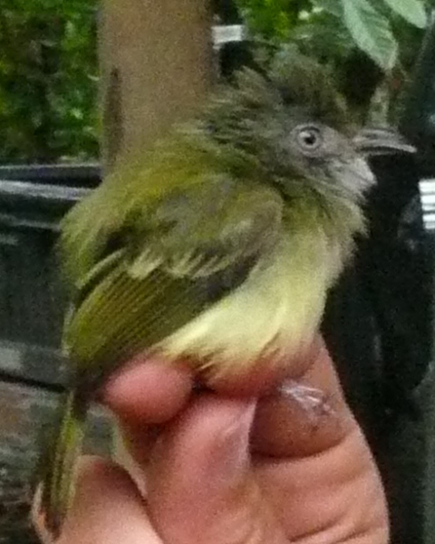 When I first saw him in the net, I thought it was the Paltry tyrannulet (Zimmerius vilissimus), a bird I see regularly at home in San Antonio and whose slightly downturned single-note call I have recently come to regognise with some degree of success. By the way, Stiles & Skutch call this bird the Mistletoe tyrannulet, a much more appropriate and less demeaning name, I believe.