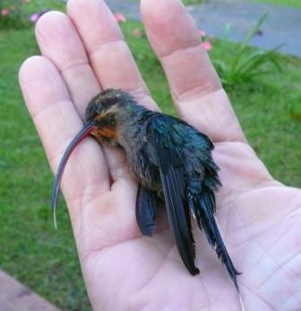 Birds continue to bang into the house windows, and unfortunately a casualty this week was a female Green hermit (Phaethornis guy). This is another species classed as common, but I have seen it only once before here in San Antonio, and never at the house. I have to apologise for putting up photos of a dead bird yet again. The central rectrices are much longer on the female, as you can see, and also the head has lots of buffy colour to it. I don’t know if the immature females acquire the long rectrices immediately, so I can’t tell whether this bird is another post-nesting wanderer or not. I’ll keep a close look-out at the heliconias in the coming weeks.