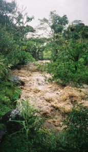 I had judged this to be a particularly good week after having banded a life-bird, a Yellow-margined flycatcher (Tolmomyias assimilis), at CATIE a few days ago, but today I was really fortunate. On a whim, I strolled uphill in the afternoon and looked over at the upper bridge by a dairy on the Quebrada La Loca, at the location where the river had taken a detour in a heavy storm several years ago, carrying away the tarmacadam surface of the village’s main road. There, sitting on a rock, up close and personal, was the garza del sol, the Sunbittern (Europyga helias), a bird I know to be resident here but which has so far always been elusive. The sunburst yellow of the wings as it flew from rock to rock was truly spectacular. After soaking in the rain for ten minutes, it occurred to me to dash home and grab the camera, returning in the truck post-haste. Yes, it was still there, and now proceeded to roam around on the bank of the river too. I had difficulty with the camera as usual, especially since now the bird wouldn’t stay still, and the following is the best shot I got. Sorry!