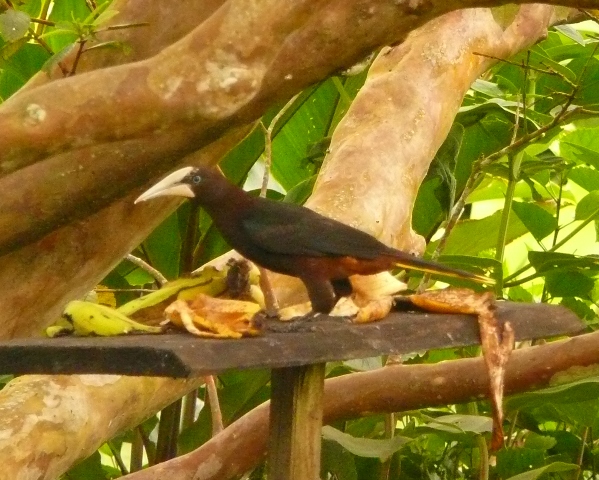 The Chestnut-headed oropendolas (two at least), by contrast, have now been here for almost two weeks. They fly in with a large flock of our common Montezuma oropendola (Psarocolius montezuma) to eat bananas at the feeder. Curiously, the larger Montezumas seem to stand politely by while the Wagleri get first bite. The Chestnut-headed is a handsome bird; with its head casque (Skutch’s term) extending upwards from their beaks, they look rather like the medieval Norman knights in the Bayeux Tapestry. I hope they will stay permanently but fear that when I run out of bananas they will head back to Guayabo National Monument. Here’s my not very wonderful photo: