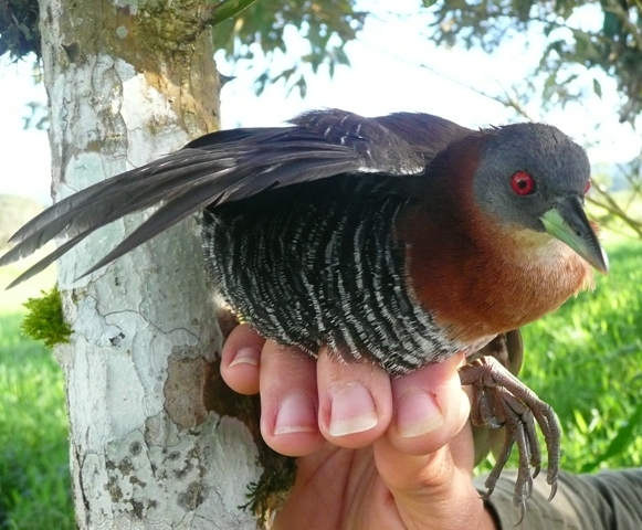 The White-throated crake (Laterallus albigularis) is surely one of the most frequently heard of the Costa Rican crakes and rails, but like most of the its coreligionaries it rarely allows itself to be seen. I certainly had never caught more than the merest glimpse of one before last week (Jan. 19), so imagine my surprise when one was caught in the nets of CATIE’s bird banding programme. The second surprise was the sheer beauty of the bird with its rufous breast, black-striped belly, green bill and red eye.