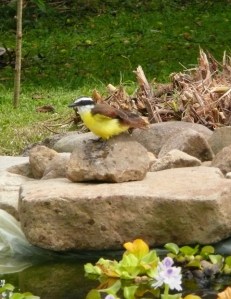 The Bi-colored hawk (Accipiter bicolor) seems a likelier candidate in terms of the description, but this is a rare species, even though it is found as high as 1800 m, and it’s another one with which I am totally unfamiliar. My glimpses forbid a definite identification. My best view was two days ago when a fairly small, dark-backed, pale-fronted hawk landed on the ground not far from the front door clutching a Great kiskadee (Pitangus sulphuratus) (perhaps a fledgling) and warding off incredibly raucous and bold attacks from two others, presumably Mum and Dad. A long, barred tail was in evidence as it flew off, but I had no time to grab the binoculars. Here’s a shot of one of my garden kiskadees.