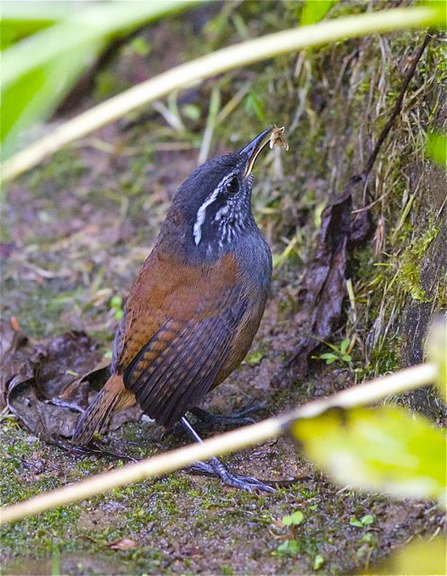 I spent quite a while in the forest patch, which is on the steep slope above the Quebrada, because I wanted to again get a good look at the Three-striped warbler (later determined to be Golden-crowned warblers) and the White-breasted wood-wren (Henicorhina leucosticta), two species that I have now found several times in that very shady.  Here too I might again see the Bicolored hawk.  Today, it was a family of wood-wrens.  By simply sitting still for several minutes I was able to get excellent views.  The first bird had not much white on the throat, and I was tempted to think that it might be the Gray-breasted wood-wren, its highland counterpart.  Both should be found at this elevation, but I had never personally been absolutely sure of the identification.  Good views of a second bird assured me that it was, indeed, the White-breasted wood-wren.  For the time being, I have no access to a photograph, but if you pretend that the breast on the bird in the following photograph is white, you will get a good idea!