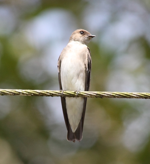 After twenty minutes of slipping and sliding over the rocks, I took the steep climb up through a grove of cypresses and onto the dirt road that leads to San Diego.  The descent to San Diego is mostly open country, but at  the side of the road I found a number of holes in the bank, one containing the nest of a pair of Northern rough-winged swallows (Stelgidopteryx serripennis).  The parents sat watchfully and with evident concern on a nearby wire until I passed by.  This is second most common swallow in our area, after the Blue-and-white swallow (Pygochelidon cyanoleuca).  It is a plain bird but can be fairly easily distinguished from the Southern rough-winged swallow (Steligdopteryx ruficollis), because the latter has a very evident pale rump, plus a cinnamon throat, seen best when the bird is perched.