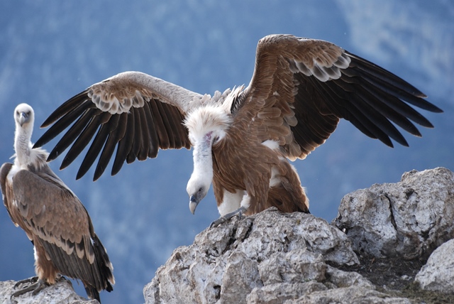 The hundreds of vultures circling the Gorges du Verdon, however, are mostly Griffon vultures, called Buitre común in Spain. These huge birds, which are practically the same size as the well-named Black vulture (in Spain, Buitre negro), are very pale in colour and easily observable, while the other species are very few in number and hard to find.
