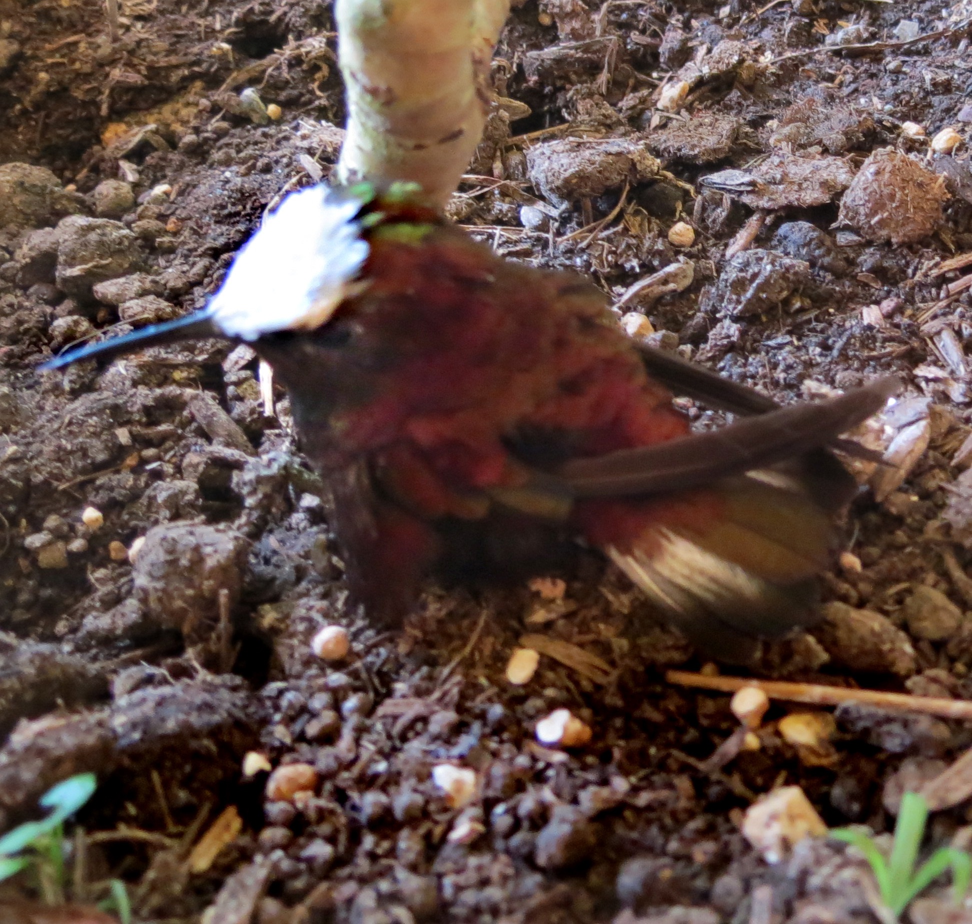 Sue took the photo and in her own words: “Yesterday I heard tiny thud on the window and ran out to make sure that I got there before the cats. A beautiful, tiny snowcap hummingbird was on the sidewalk. (They are one of the smallest hummingbirds, weighing about as much as a penny, so he must have hit pretty hard to make a thud.) I put him in one of the hanging baskets and he was gone when I checked a few hours later. Here is a photo of him recovering in the geranium basket. The photo is poor because I didn’t want to stress him and stuck the camera near the basket quickly and didn’t use a flash”. Snowcaps were not on Wiet’s list of hummingbirds that she has seen at her feeders. I guess that they do come up this high, though. (This guy might like to stick to the lowlands from now on.)
