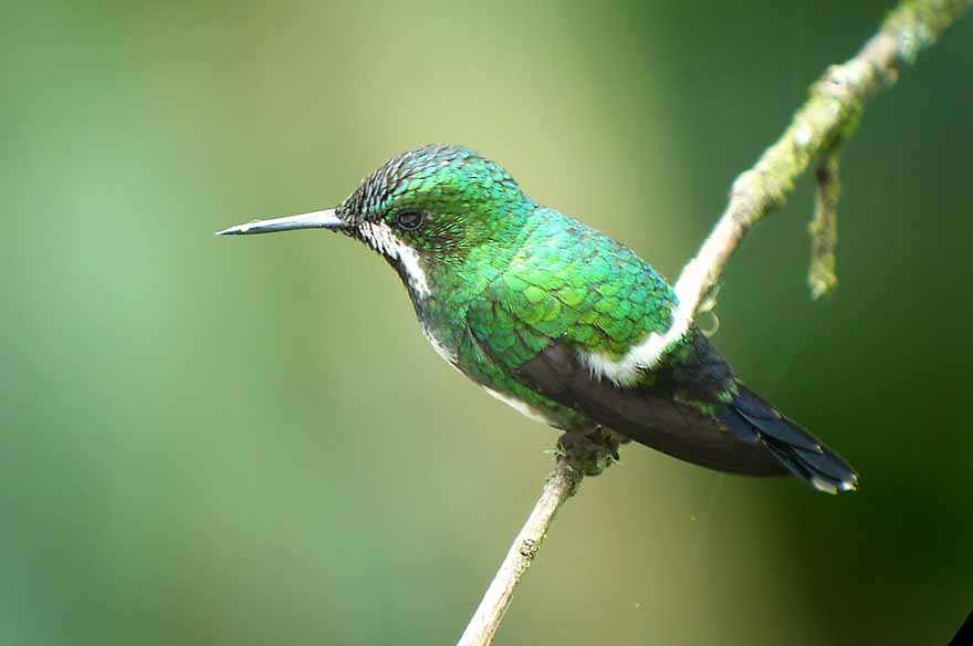 Post-nesting time always seems to bring me sightings of new hummingbirds. Mostly they are species that a visitor to the area might expect upon consulting the Costa Rican bird guides. This is the case with the Green thorntail (Discosura conversii), which appeared yesterday at a rabo de gato hedge as I made my way down to San Diego. The hedge is the same one that attracted my first Black-crested coquette (Lophornis helenae) last year. It is located less than 1 km away, before the descent to San Diego, and it is thus at roughly the same elevation as my house in San Antonio, where I have never seen it in these more than six years.