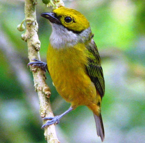 It’s Bird of the Weekend for me here in San Antonio, where it actually occurs rather infrequently. Just a five-minute walk in the garden will usually produce Blue-gray, Palm, Passerini’s and Golden-hooded tanagers, all species that I can mostly tick off as birds observed on any given day. Those visiting Costa Rica for the first time will also surely count all these among their first sightings. But the Silver-throated has been in the garden on only two or three occasions, so whenever I see one I am taken back to the highland forest of Bajo del Toro. This bird is found mostly at middle elevations. Its Spanish name, Tangara dorada, golden tanager, fits it equally well, since the first impression is usually of a mostly golden-yellow bird with black stripes on its back. However, it’s the silvery throat that prevents any problem distinguishing it from other yellow tangara species. I am becoming more familiar with its buzzy call note, quite different from the calls of the other tanagers in the garden. This one wasn’t in the garden, but a few minutes away at don Martín’s. He was busy planting nísperos, while I was hoping for another look at the Fasciated tiger-heron. The Quebrada was full and running noisily, making the spot even prettier than usual, but no aquatic species were to be seen. The tanagers, at least two, appeared on the slope, fussing in some branches above Martín’s head. That’s the second sighting of this species at that location close to the patch of forest.