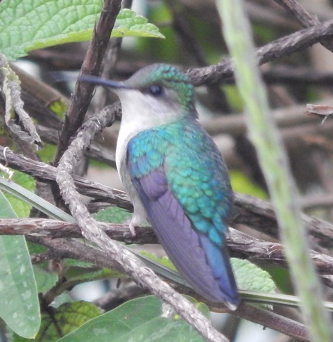 This bird did not reappear the next day, but female Crowned woodnymphs (Thalurania colombica), a medium-sized species, also appeared each time at the same rabo de gato hedge. The females are any easy identification with their U-shaped white above green pattern of throat and belly. Note that the English name has now reverted to what it was in Stiles & Skutch (A Guide to the Birds of Costa Rica). I took this blurry photo of a female at, you guessed it, a rabo de gato, in nearby San Rafael.
