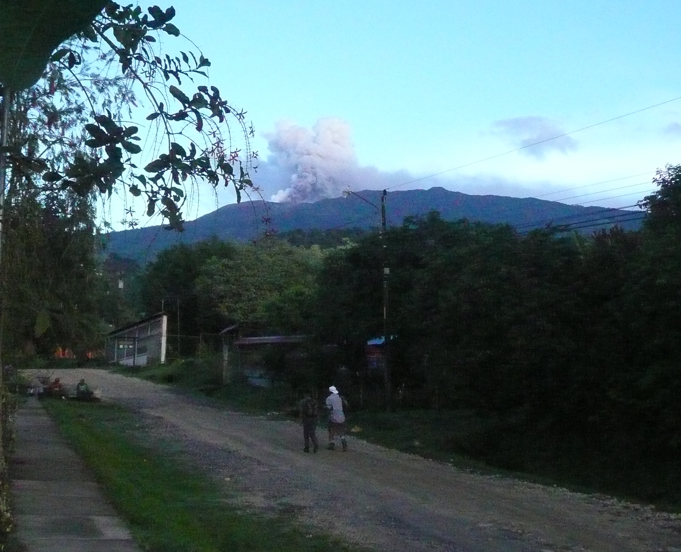It’s a gloomy day here in San Antonio. The volcano is no longer in sight, though the threat remains. November is threatening to bring constant daily rain, as was often the case until the last couple of years. The birds at the feeder have almost finished off the last of my bananas, though at least one more bunch is slowly ripening. The usual chachalacas, yigüirros and sundry tanagers and saltators are all in attendance, but so too is the Blue-crowned motmot that has now been in the garden for at least two weeks. He’s quite feisty and more than holds his own against the rest. His method for spearing the banana is a very rapid jab from a bit of a distance, while the Montezuma oropendolas prefer to hold the banana down with their feet, gobble down two or three large chunks and then fly off with a final big lump firmly in the bill.