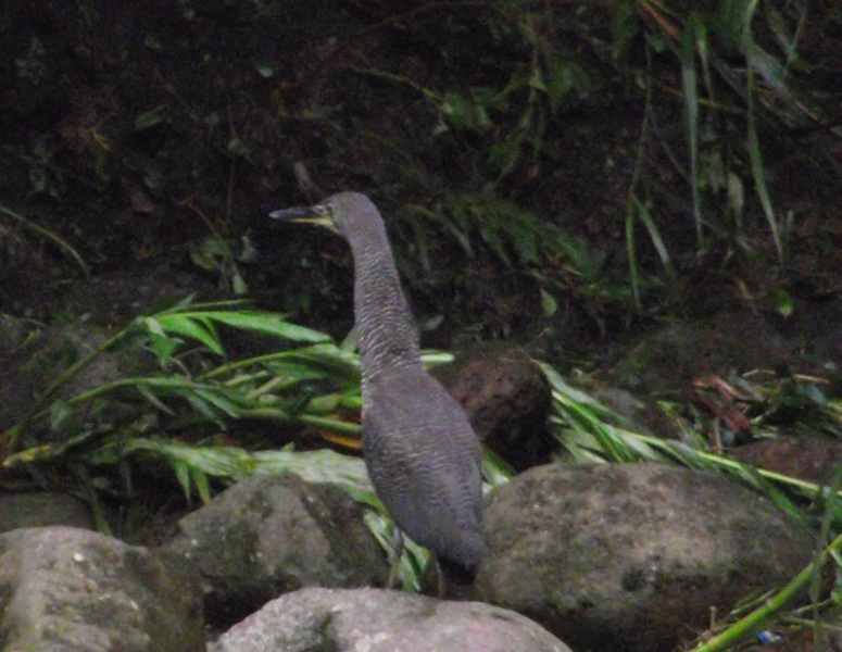 I took a late afternoon stroll down to don Martín’s cabin on Quebrada La Loca and was very fortunate to find the Fasciated tiger-heron (Tigrisoma fasciatum) (adult) fishing in the now rather swollen stream. The bird was rather skittish and took off with heavy flaps at each attempted approach of mine. Finally, it flew up into the foliage of some trees overhanging the stream and was lost from view. Assuming that this is the same individual, I hereby present don Martín’s very own but not very sharp photo, taken some months ago.