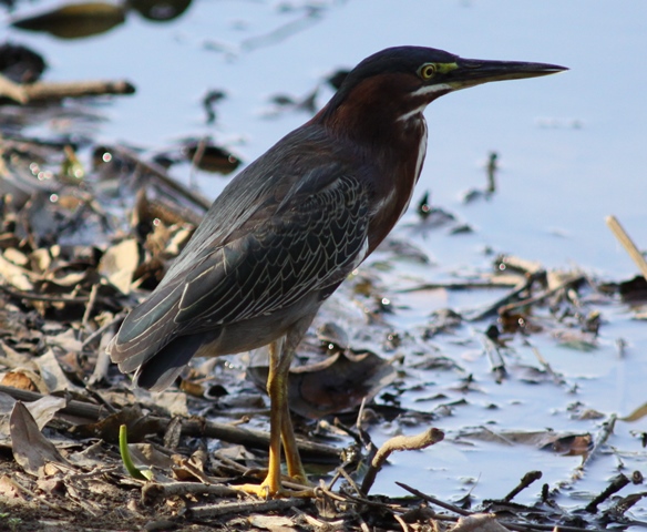 After our scare with the Great blue heron (we lost two white koi), we now have the Green heron ( ) back at the ponds in the garden. While this is lovely for observing this beautiful bird, I greatly fear for our new koi, who are quite small. What size fish can a Green heron gobble? Unfortunately my internet research seems to indicate that they can take rather large fish. Green herons are remarkable, it seems, in that they are one of the very few tool-using birds. They take bits of vegetation and insects and drop them on the surface of the water as bait to lure their prey to the surface.