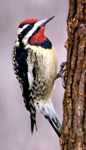 To add to a possible confusion among all the birds, a calling Black-cheeked woodpecker (Melanerpes pucherani) was also present, but the sapsucker is not to be mistaken, with its white wing-patch. The sapsucker was a beauty with its red crown and throat and yellowish white below the black on the breast. I think this is my third sighting in almost 8 years, with the previous ones being immatures or females. Many thanks to Patrick Coin for the use of his fine photo of a male, taken in North Carolina. I can find no photograph of a male in Costa Rica.