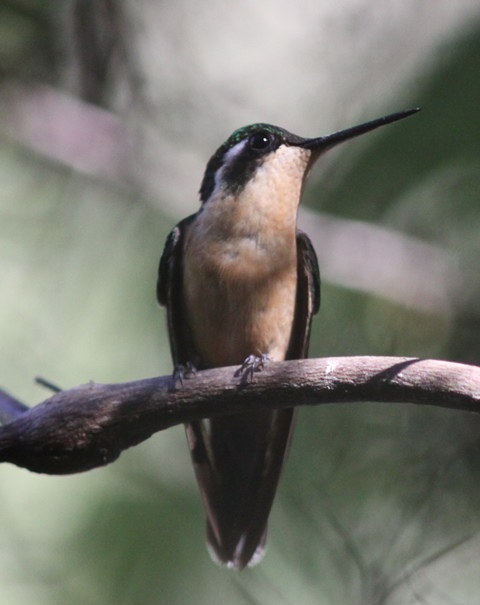 Best of all, perhaps, was a female Purple-throated Mountain-gem (Lampornis calolaemus) that allowed close-up views for a minute or more. This individual was very easy to identify as a mountain-gem because of the rich cinnamon, almost rufous, colour of the breast and the post-ocular stripe. However, since this was a female, I am not entirely confident that this was the Purple-throated, since Garrigues and Dean (new edition of The Birds of Costa Rica) state (p. 154) that the female White-throated Mountain-gem (Lampornis castaneoventris) is virtually identical. It is noteworthy that the Latin name, castanoventris means chestnut-bellied. However, this species (previously termed Gray-throated) is supposedly restricted to the Talamanca range, which begins on the other side of Turrialba. On the other hand, the White-bellied Mountain-gem (Lampornis hemileucus) is surely found in our area but here can presumably be excluded since the female is said to be as white-bellied as the male. The picture is further muddied by the reservations expressed in Stiles and Skutch (A Guide to the Birds of Costa Rica, pp. 225-227) regarding possible hybridisation of these species.