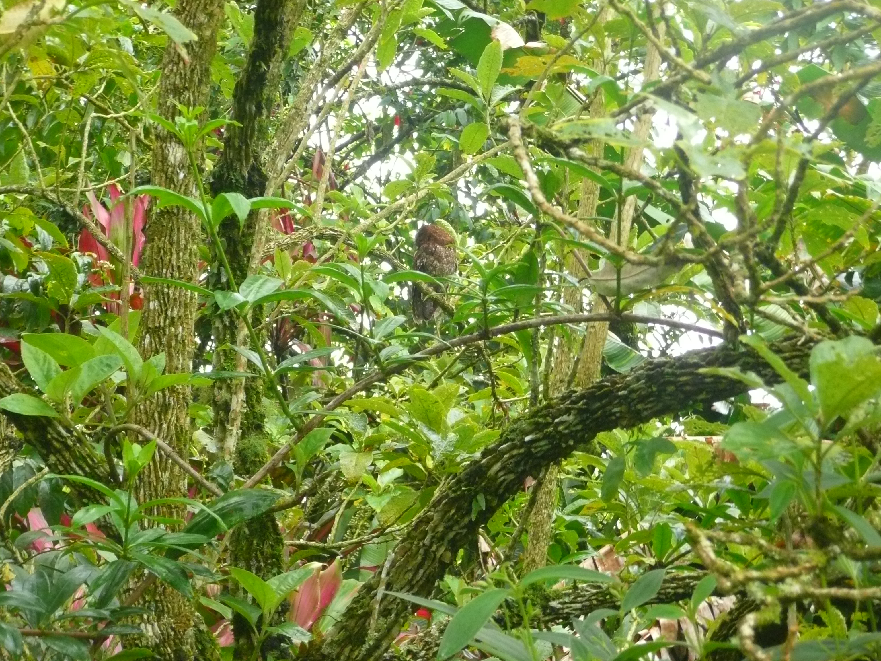 My very first Costa Rican owl was the Bare-shanked Screech-owl (Megascops clarkii), and I quickly became accustomed to hearing it calling at night. Some habitat loss in the last year seems to have made it a much less frequent visitor, but today I was treated to a detailed close-up look at a very tawny-faced adult, with prominent ear tufts, in our driveway güitite tree, at 4.30 in the afternoon of an overcast day. The owl paid no attention to the commotion caused all around him by a host of small but very annoyed garden birds. My little camera again failed to reproduce what my new Vortex binoculars were showing me, but here are the two best photos I could manage.