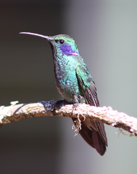 I took advantage of a mostly dry day in this El Niño year to see if vehicles can now get down to nearby San Diego. After the excitement of the trek up the Turrialba Volcano earlier in the week, birding in my patch was expected to be perhaps less than thrilling. Surprise surprise! The porterwood hedge at Carlos Luis’s little house before the drop down to San Diego produced not only a female Scintillant Hummingbird (Selasphorus scintilla) but also a Green Violetear (Colibri thalassinus), who sat and preened for a good while. Plumage of males and females of this species is essentially identical. The photograph above is from Karel Straatman‘s collection of Costa Rican bird photos and clearly shows the main field mark, the violet patch behind and below the eye. This was only my second Green Violetear sighting but for me the first field mark was the lovely dark blue tail. The dry trill heard when it is in flight is also quite different from the sounds made by our local hummer, the Rufous-tailed Hummingbird. This particular bird exhibited strange behaviour, moreover, in that, when perched, it twisted back its head almost in a contortion, rather like a male Great-tailed Grackle during courtship.