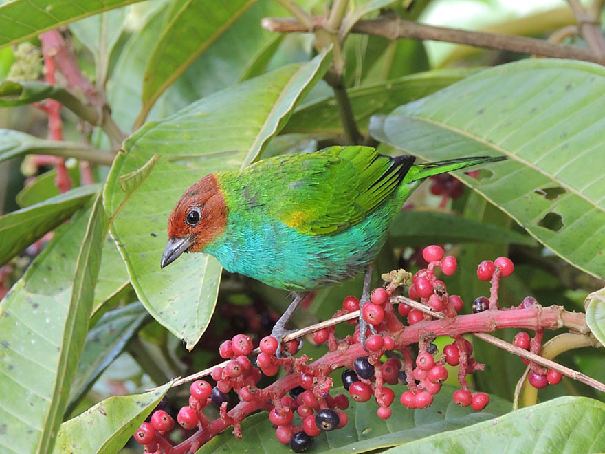 If you wait around long enough, and if there are no noisy picnickers, you can find many different species here. Tanagers and flycatchers are probably the most numerous. Here’s a photo from Richard Garrrigues’ collection showing a male Bay-headed Tanager (Tangara gyrola), a species that you’re almost sure to find there. Be sure to exclude the Rufous-winged Tanager (Tangara lavinia) by making sure that only the head is chestnut-coloured.