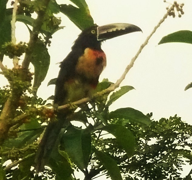 My wife Ches’s photo is a little fuzzy but that’s the fault of our tiny camera! I generally have to use photos taken by friends and well-wishers but this time she was able to get up close enough to this guy seen above in the güititi tree. The Collared Araçari (Pteroglossus torquatus), locally known as the cusingo, is one of the 6 toucan species found here in Costa Rica. Pedant that I am, I always insist on writing (and pronouncing!) the cedilla ç (yes, Barcelona FC is Barça) of the Brazilian Portuguese name of this bird. At 16 inches it’s a little bit smaller than our common Keel-billed Toucan (Ramphastos sulfuratus), and this week marks only my second sighting of the species in San Antonio, the first in our garden. The Collared Araçari, like its Pacific counterpart the Fiery-billed Araçari (Pteroglossus frantzii), which adorns the cover of the new edition of Garrigues and Dean’s The Birds of Costa Rica, is a lowland species not much seen above 1000 m. I see it fairly frequently down at nearby San Diego (approx. 1000 m) but it’s certainly unusual here in the village of San Antonio.