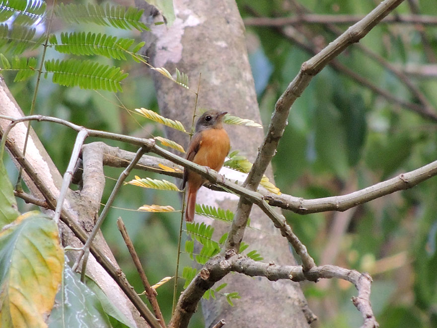 The dirt road leading to the hamlet of La Esperanza that branches off the road to Pejibaye and Tucurrique definitely merits much further investigation. This week’s morning visit with Daniel Martinez brought not only a long list of sightings but a life bird for me in the form of the Ruddy-tailed Flycatcher. The bird perched for us nicely at quite close range, which was quite a boon after an hour or so of neck-ache while peering up into the often dense forest.This species’ status in Costa Rica has gone from common to uncommon between the first publication of Stiles & Skutch in 1989 and the appearance of Garrigues and Dean‘s latest edition of the field guide The Birds of Costa Rica (2014). Its altitudinal range seems to end at around 1000 m on the Caribbean side, so I’m not expecting to find it up here on the lower volcano slopes.