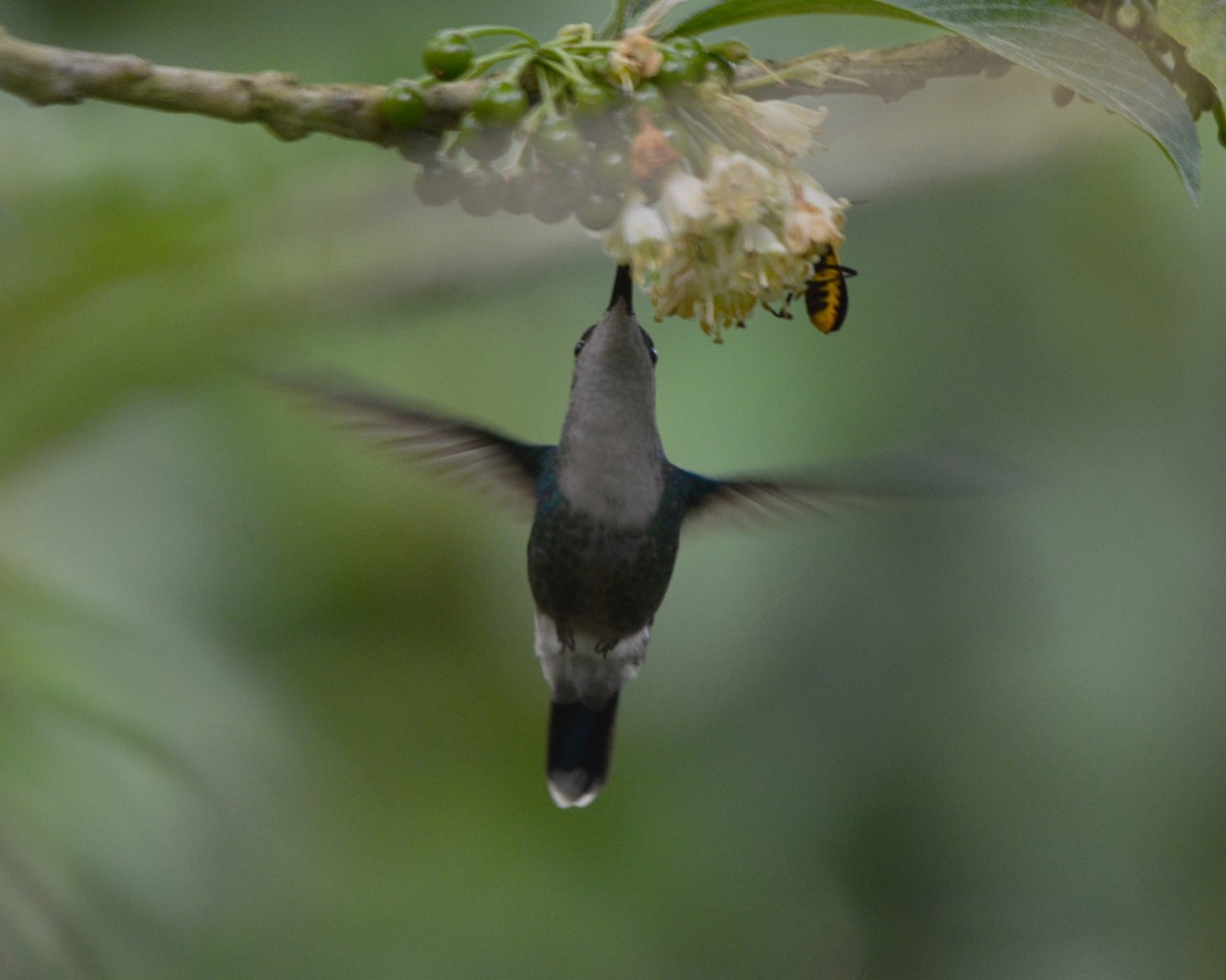 Note that the eye-ring on the flatbill forms a complete and perfect circle, while that of the Yellowish Flycatcher is teardrop-shaped and is behind the eye. There were no other species of real note, but Larry also managed a nice shot of a female Crowned Woodnymph (Thalurania colombica) that was feeding on a flowering güitite: