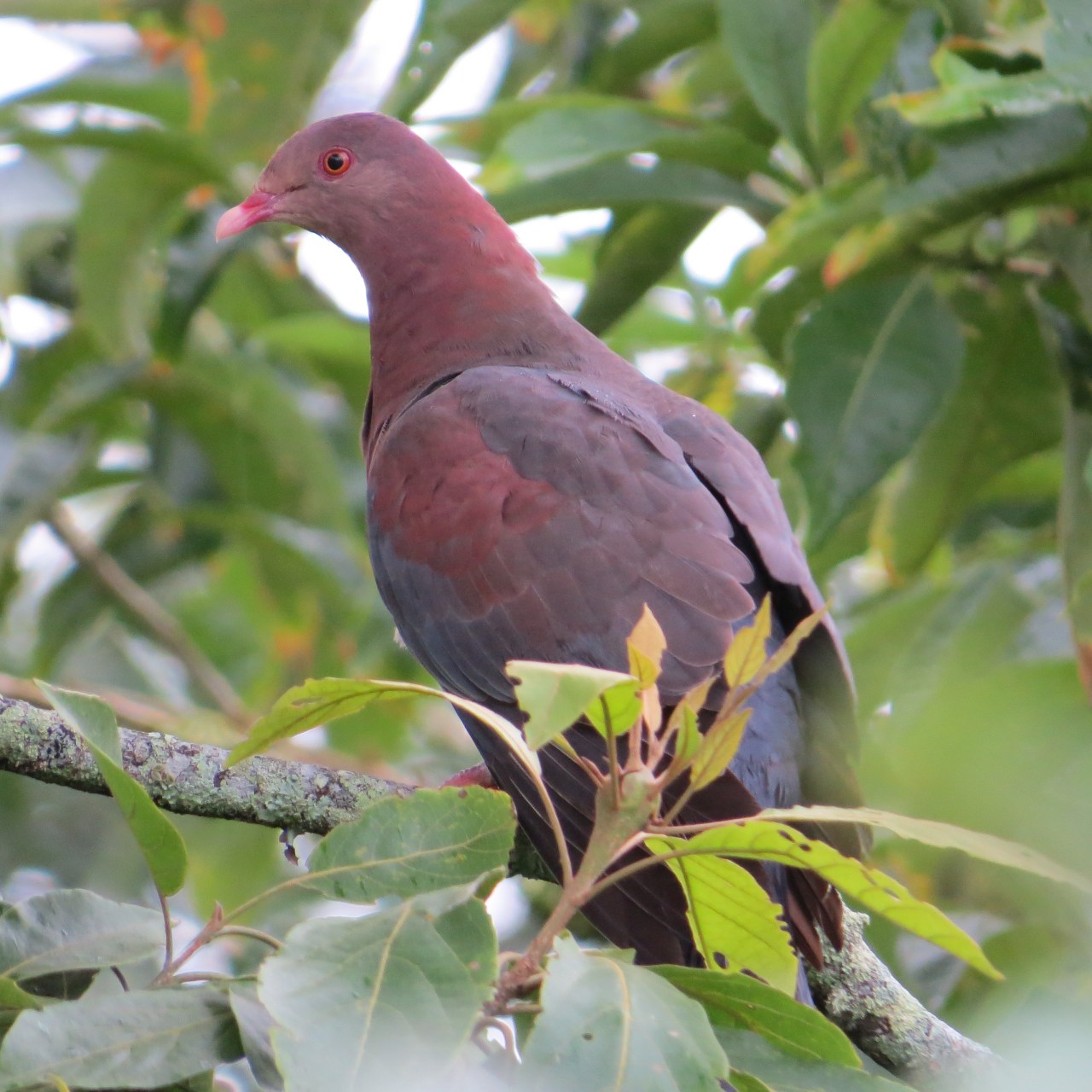 Large pigeons flying above ground-level in our area are almost exclusively the handsome Red-billed Pigeon (Patagioenas flavirostris). The common Rock Pigeon (Columba livia) no longer nests at the church and you have to descend to the larger towns of Santa Rosa and Turrialba to find it. It was therefore not much of a surprise to find as many as 13 Red-billed in just one tree at El Carmen on my walk down to El Banco this week. This species is quite common in all the northern half of the country up to an elevation of around 2000 m.
