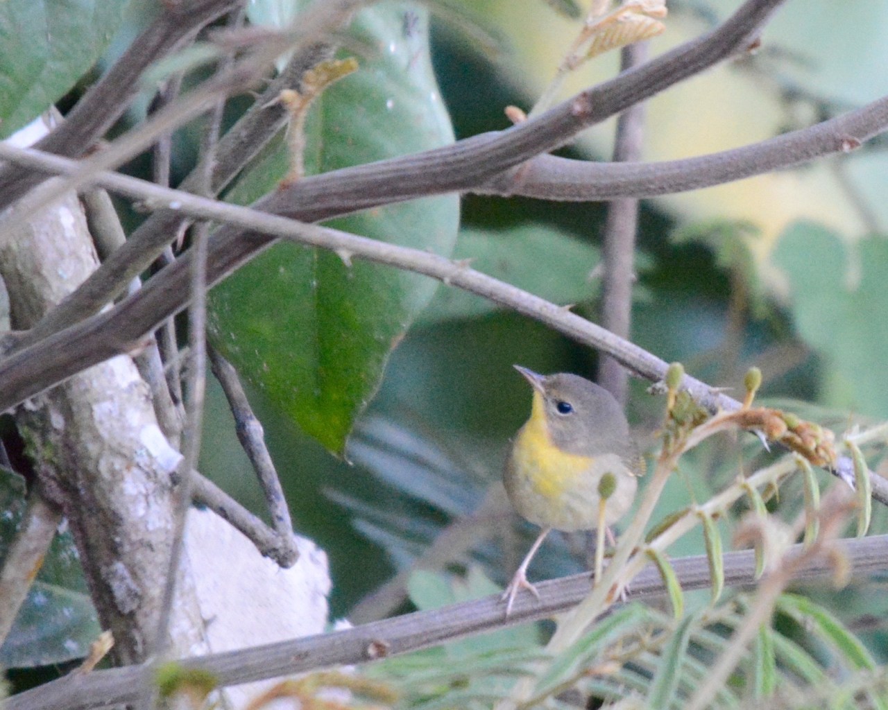In Costa Rica the Common Yellowthroat, distinguished from the others in the male by the clean white border above the black face mask, is both a passage migrant and an uncommon winter resident. In the case of the bird(s) that Larry and I found at Casa Turire, we have (a) winter resident(s) since migratory passage is between mid-October and November and, on the return journey, between April and early May. The bird guides state that winter residents tend to be single birds but we’re hoping that the pic below will confirm that the female was also present. Both pictures were taken at the same location but matters were complicated by the presence of at least one Mourning Warbler (Geothlypis philadelphia), another North American migrant whose females and immatures are not always easy to distinguish (for me, at least!) from the three Costa Rican Yellowthroats, Masked, Gray-crowned and Olive-crowned. However, as you can see, our bird here has very little yellow below, while the aforementioned species have mostly yellow underparts.