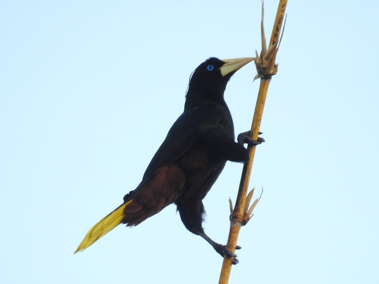 The Montezuma Oropendola is absent from the southern Pacific (and indeed from almost all the Pacific Coast including dry Guanacaste in the north). It is replaced in a large part of the southern Pacific by the Chestnut-headed Oropendola (Psarocolius wagleri), an otherwise Caribbean species, which is also found in our area but usually in more forested environments. The Chestnut-headed is very similar to the Crested Oropendola but is rather smaller. It shares the ivory bill, blue eye-ring and yellow tail: