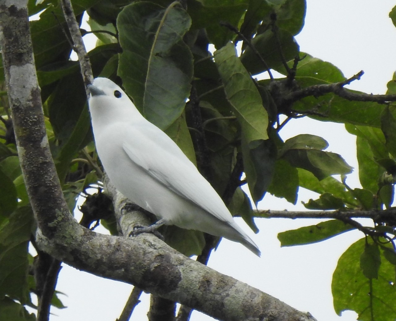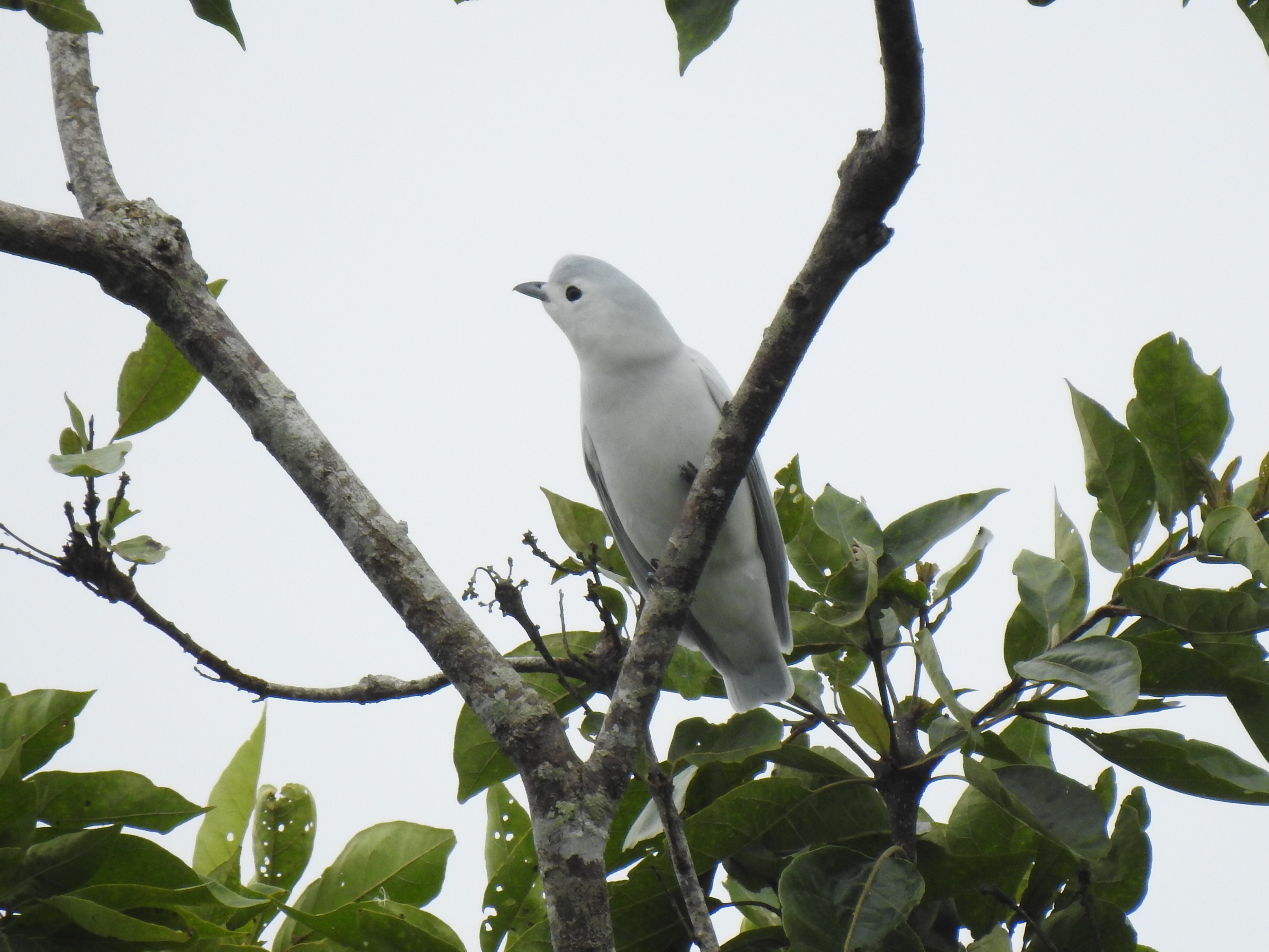 What a beauty! If you see a small all-white bird in the treetops in Costa Rica, it’s unlikely to be the species above. Today’s sighting was only my second despite having lived here so long. The Snowy Cotinga (Carpodectes nitidus) is one of 4 birds in this country that bear the English name of cotinga. It is the only one of these that can be found not too far from Turrialba. However, you need to know exactly where to go and have a little bit of luck too. This time we found a single bird at Lagunas de Bonilla, but that’s almost in Limón province.