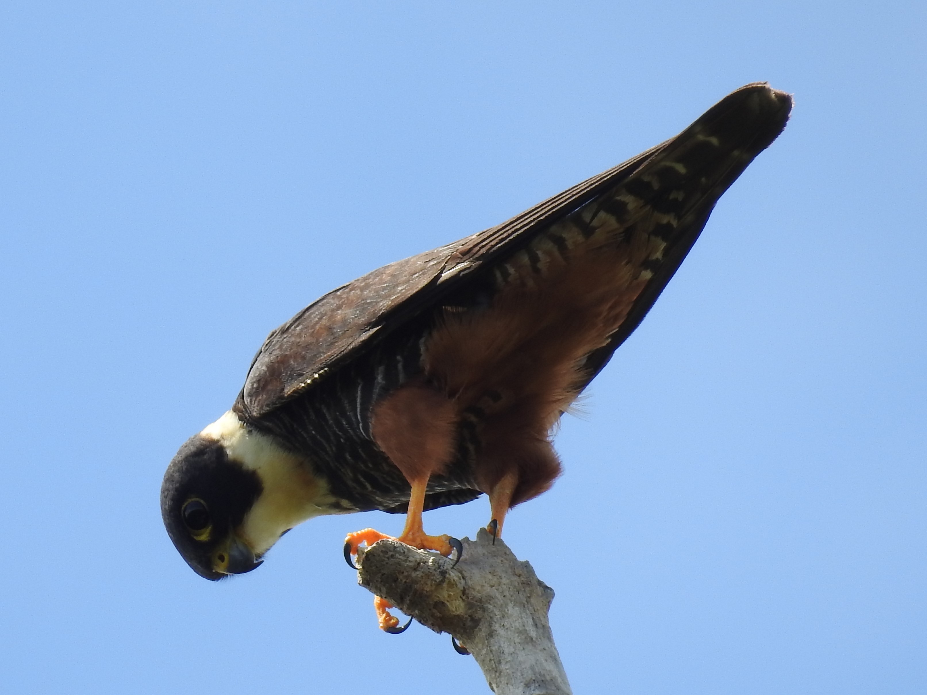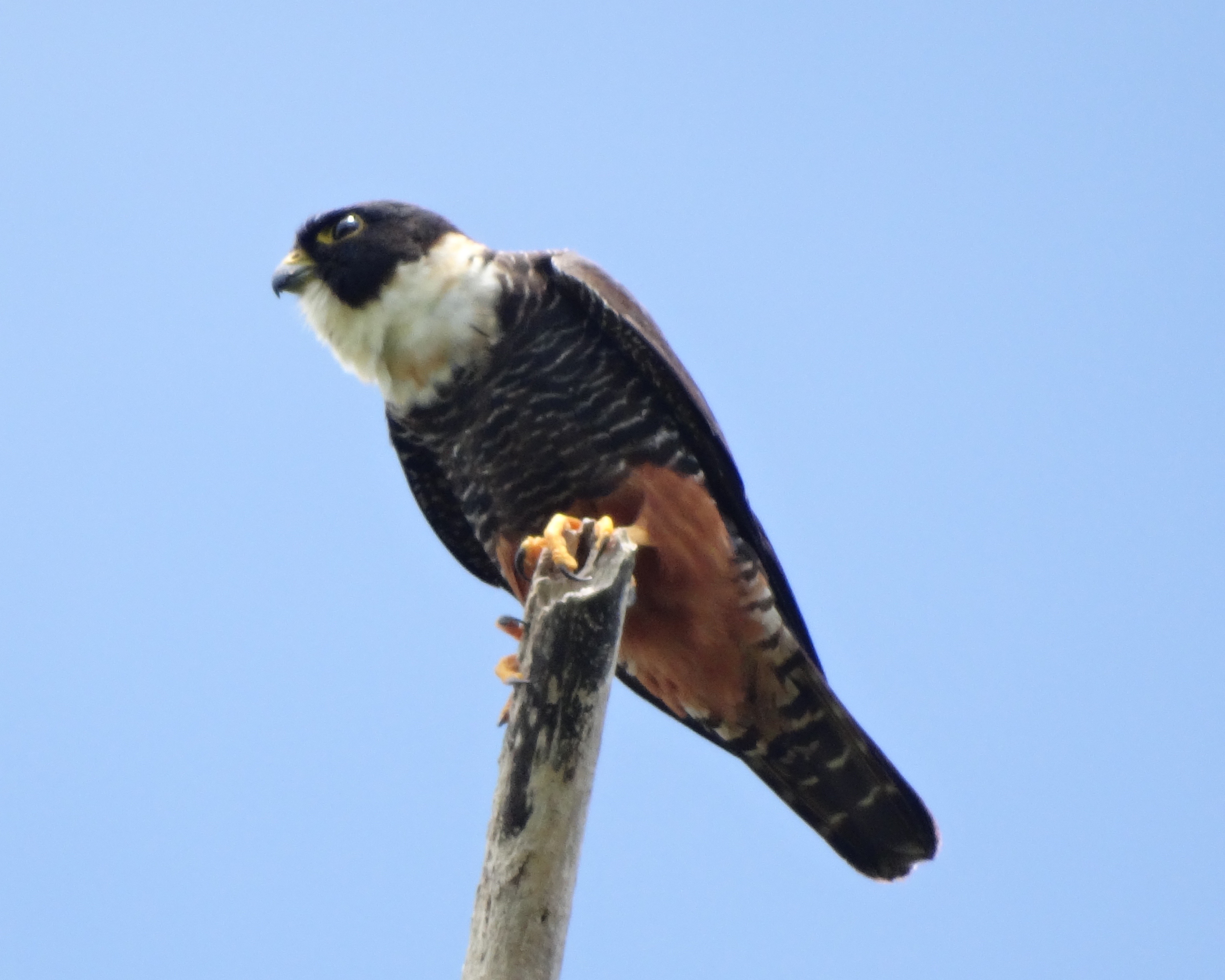 More typical of Costa Rica is the little Bat Falcon, the last of our seven species.Its range extends from northern Mexico down through most of the northern half of South America. It is a smaller version of the Orange-breasted Falcon, a bird that has near-threatened status and is rare or accidental in Costa Rica. Near us in San Antonio a breeding pair occupy a huge tree overlooking the La Cascada waterfall. However, the following images are of an individual in the southern part of the country: