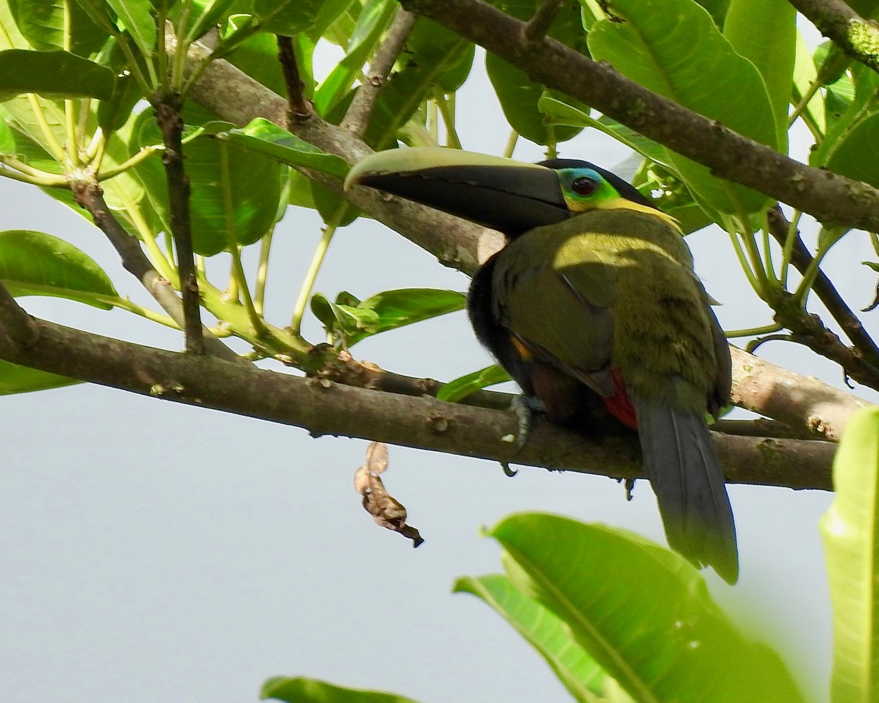 In general it’s easy to see toucans in Costa Rica. There are 6 different species and practically all areas of the country have at least one species that is an everyday sighting. In the Turrialba area, as in many others, the Keel-billed Toucan (Ramphastos sulfuratus) is omnipresent except at the highest elevation. Almost as frequently observed is the Collared Araçari (Pteroglossus torquatus), while at higher elevations the Northern Emerald Toucanet (Aulacorhynchus prasinus) is not uncommon. The only other toucan species in our area is the Yellow-eared Toucanet (Selenidera spectabilis), which according to my experience I have to consider a rare species :