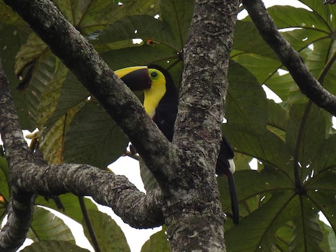 The species was relocated at the same site the very next day. Finca Tres Equis gives Cartago birders the chance to see species like this one that are otherwise difficult to find in the province. Another example is the Yellow-throated Toucan (Ramphastos ambiguus). In John Beer’s photo below, taken at Finca Tres Equis, the bird is unfortunately partly obscured by the tree trunk: