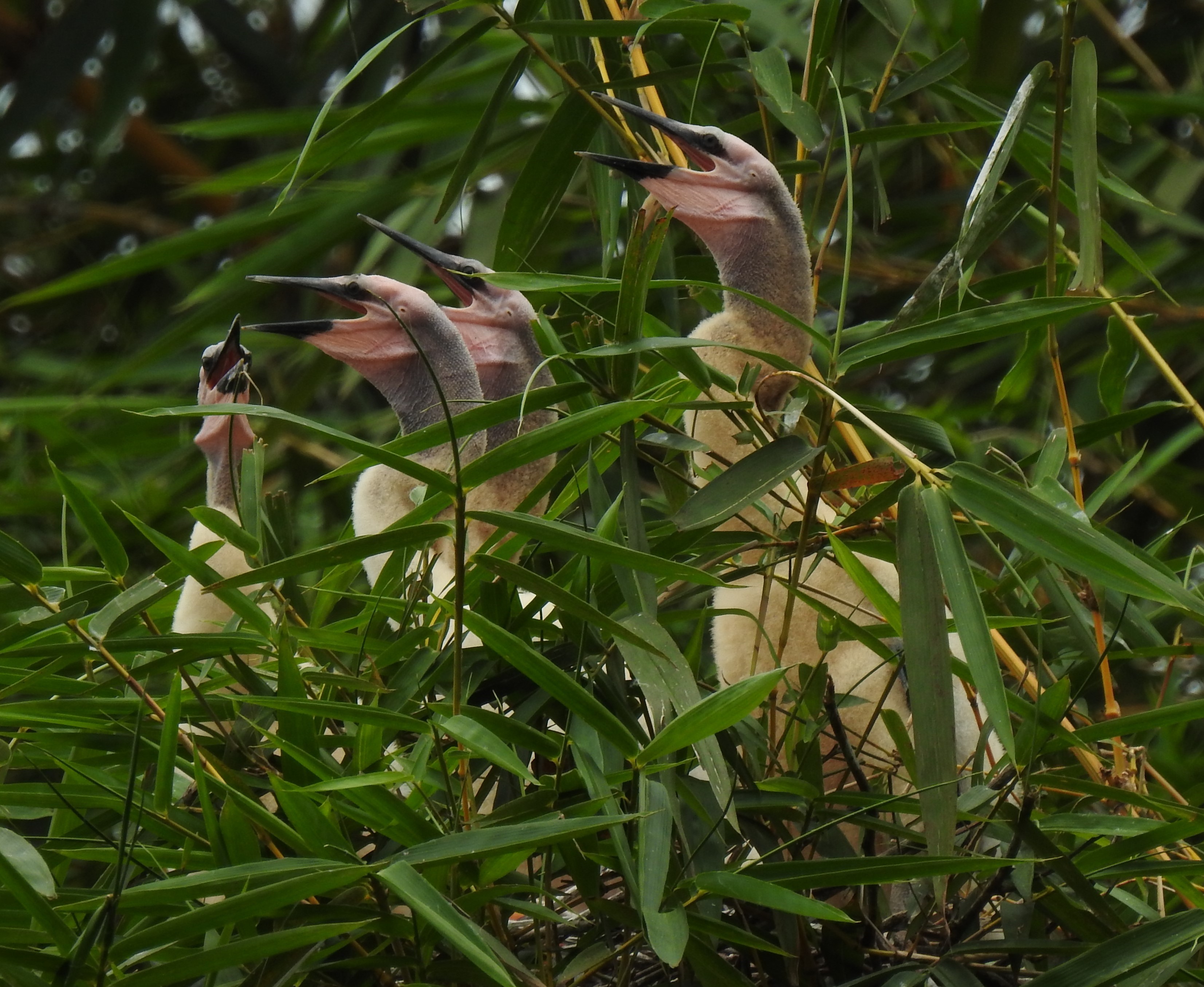 Four young Anhingas clamour for food from dad. Photo by John Beer