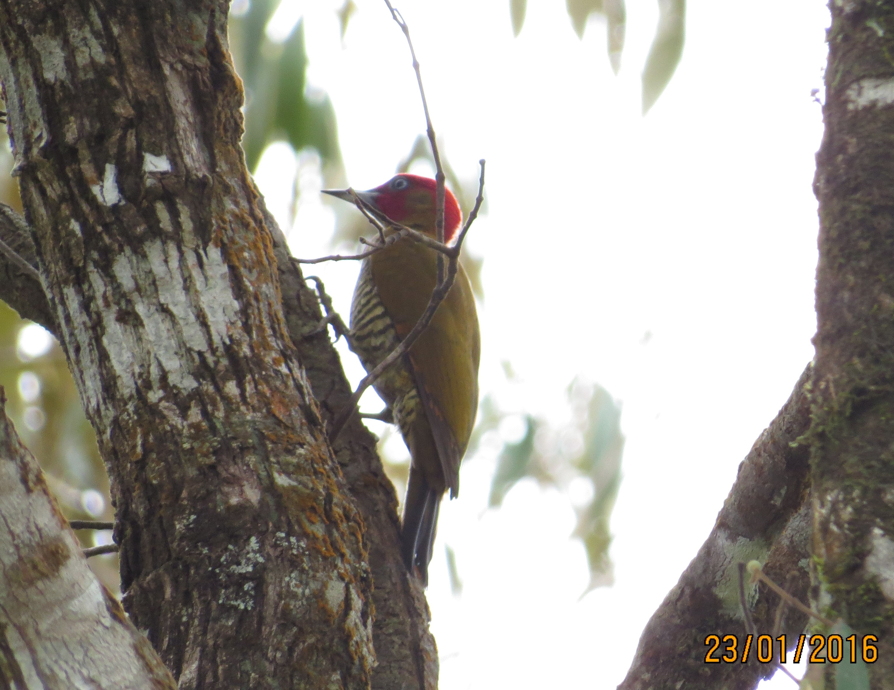 The dark cheek and light iris must be noted to avoid confusion with the Golden-olive Woodpecker (Colaptes rubiginosus), a relatively common middle-elevation species that did not appear on this trip: Here’s a side-by-side comparison of male birds: