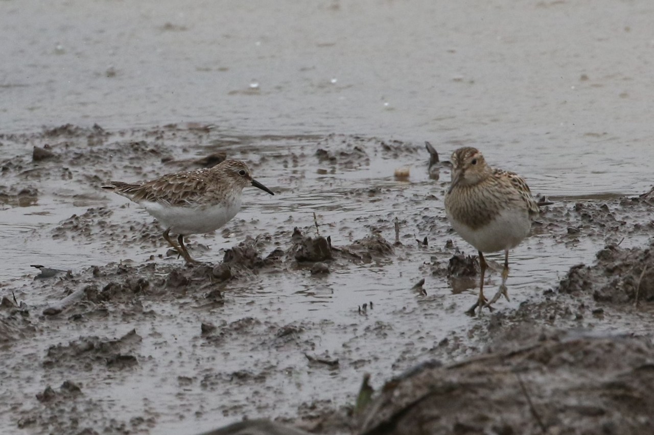 As its name implies, the Least Sandpiper (Calidris minutilla) is the world’s smallest sandpiper. Its pale yellow legs are a good field mark, if they are not covered in mud! As the photograph below shows, it is obviously much smaller than the Pectoral Sandpiper: