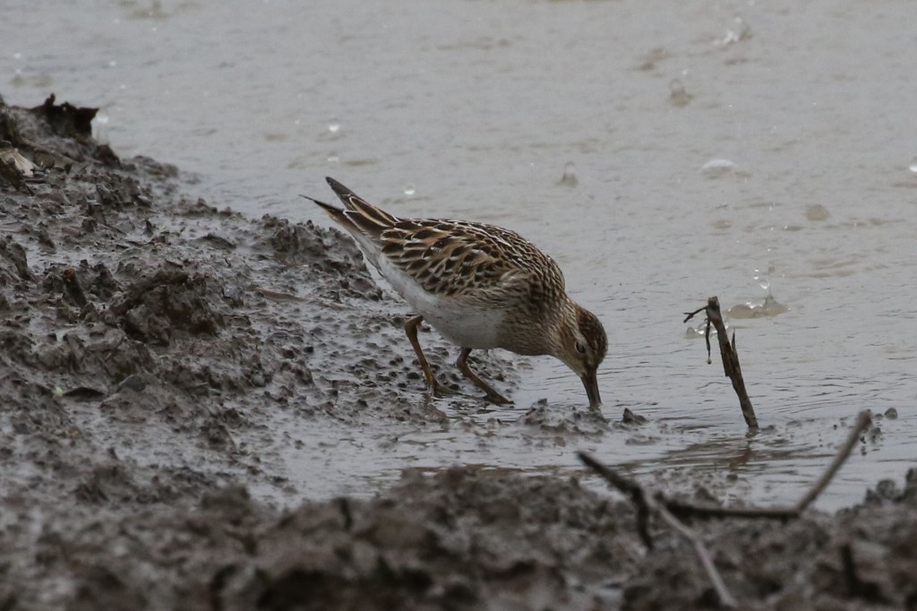 Pectoral Sandpiper probing in the mud. Note the abrupt line across the breast where the streaks end; photo by John Beer