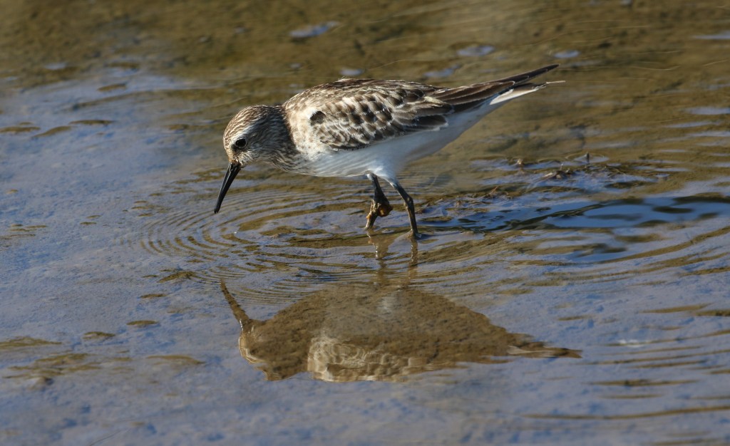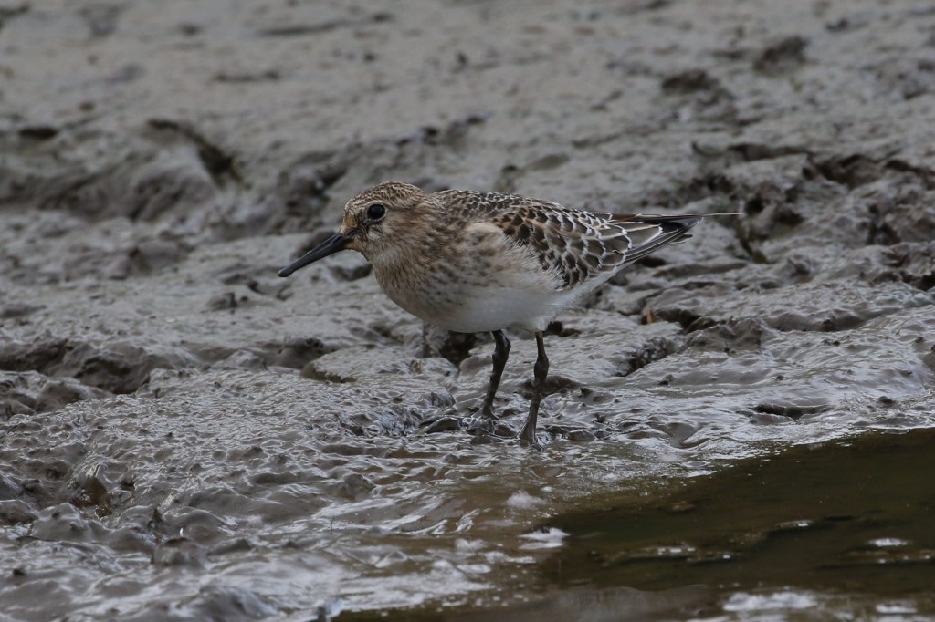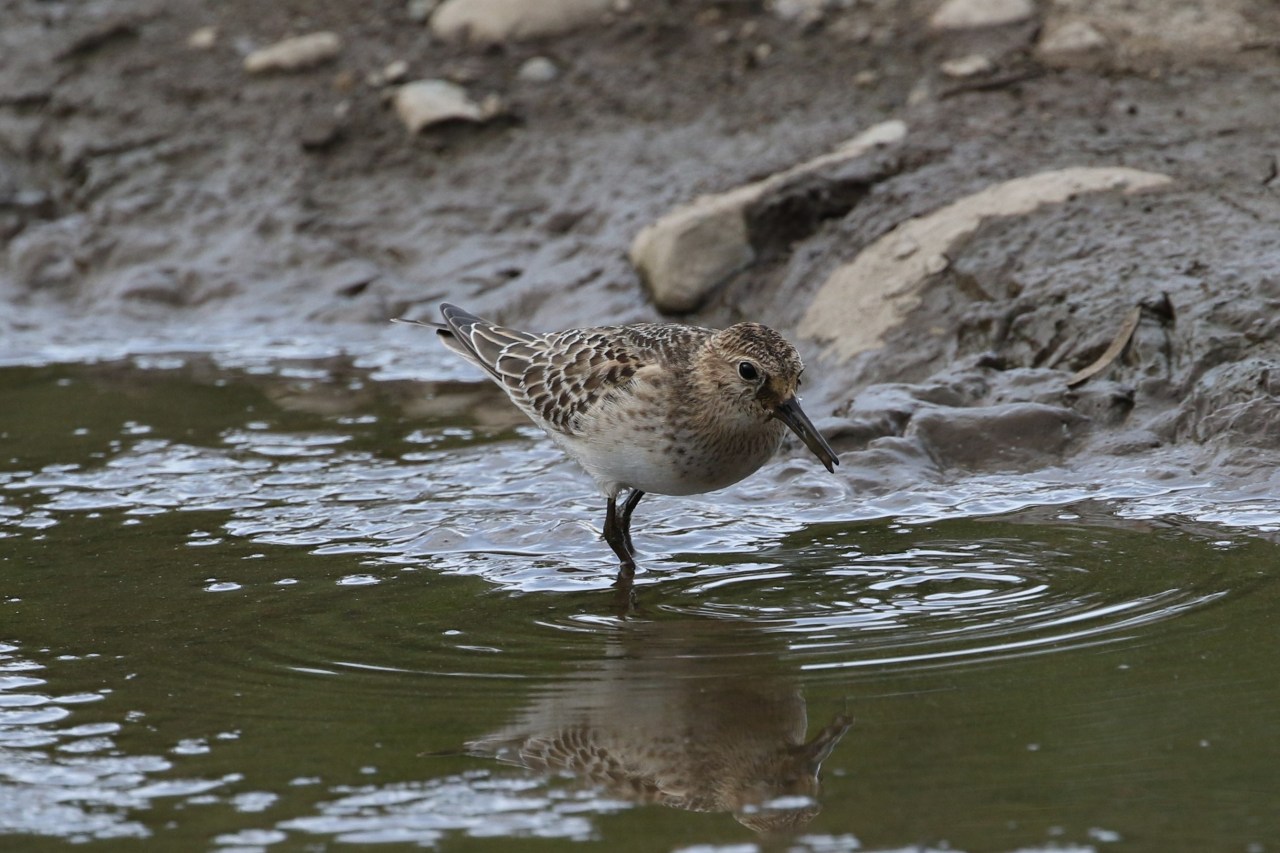 Baird’s Sandpiper has a much less well-defined ‘necklace’ on the breast than the Pectoral Sandpiper. It is smaller, yet still much larger than the smallest ‘peeps’. Furthermore, it has a long wing extension, clearly seen when the bird is on the ground.