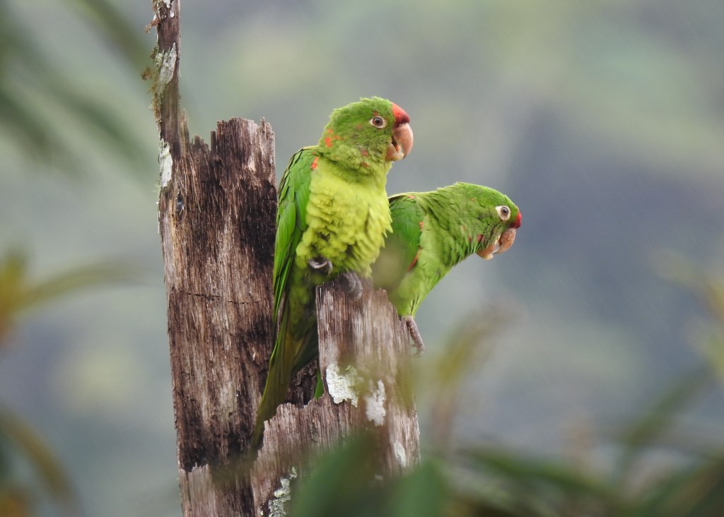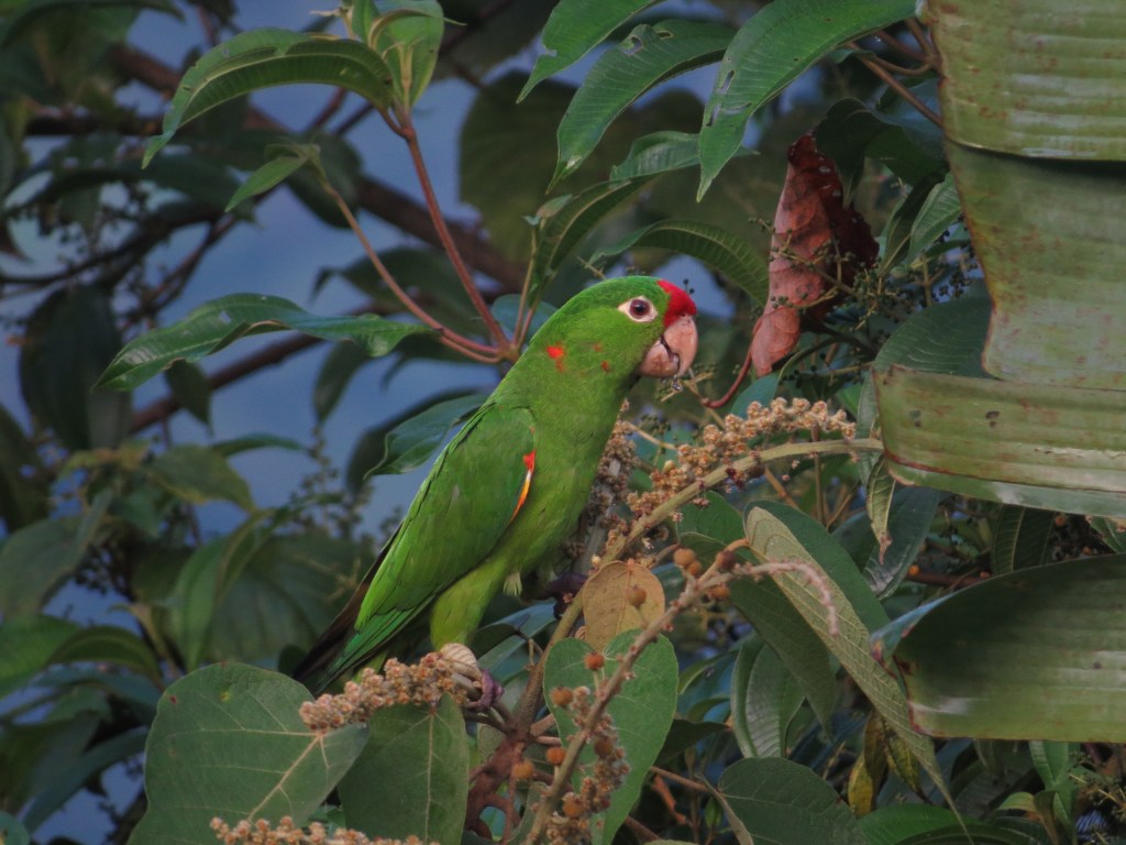 Visiting Central America for the first time? Simply by arriving at the airport in Alajuela, Costa Rica, and travelling on via the nearby capital, San José, you will almost immediately be able to add a ‘lifer’ to your list of bird sightings. The Crimson-fronted Parakeet (Psittacara finschi) is an even more abundant species than the White-crowned Parrot, the subject of my last post. It’s a noisy inhabitant of town centres (Turrialba too) throughout Costa Rica. These and other parakeets can be distinguished from parrots by their long, pointed tails.