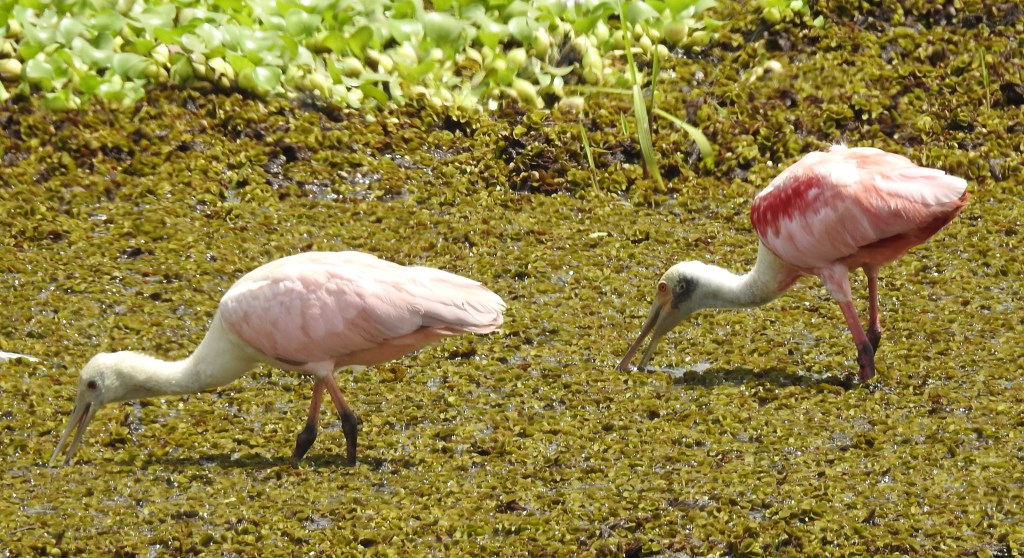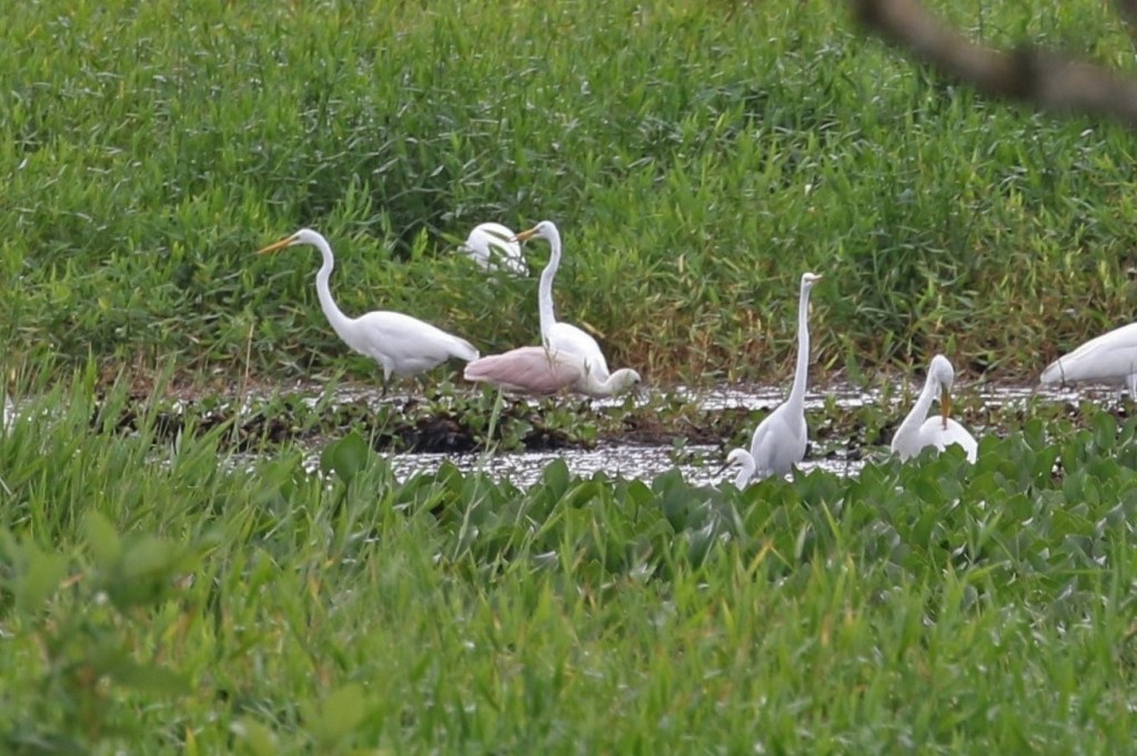 Immature roseate Spoonbill feeding with Great Egrets at Angostura; photo by John Beer