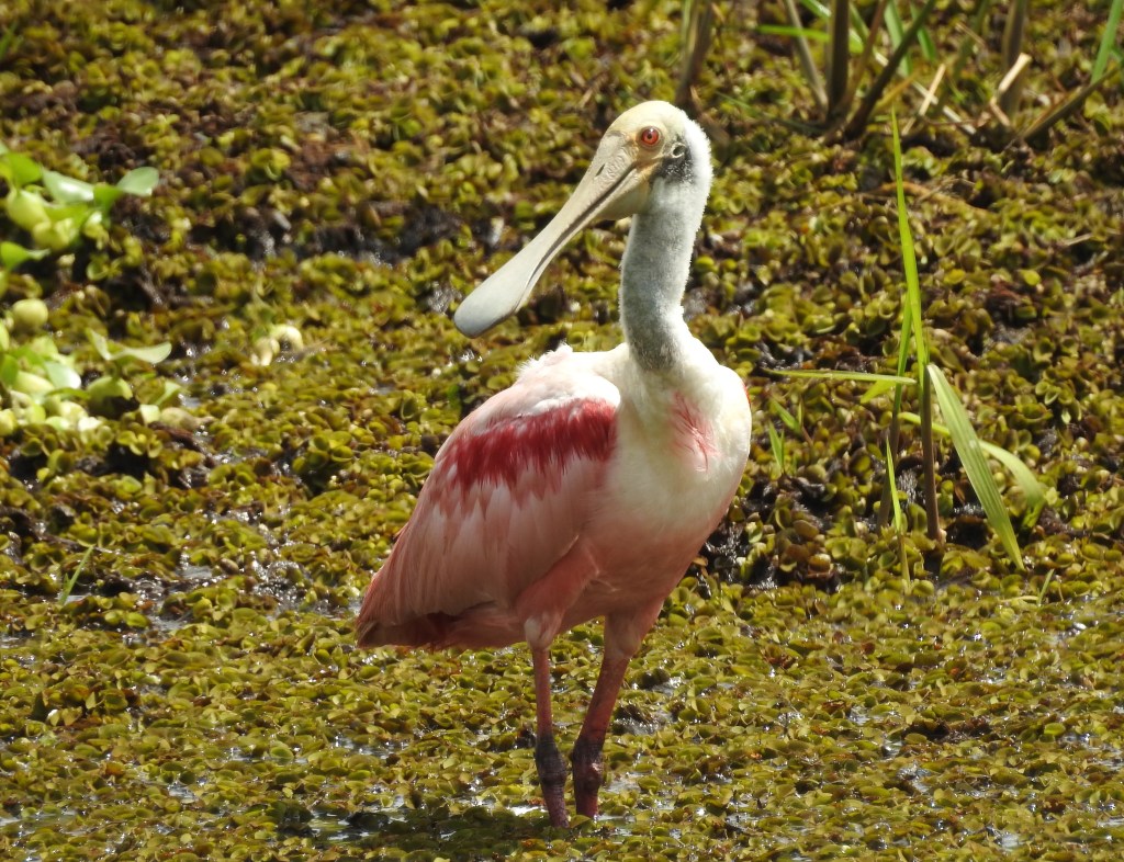 The Roseate Spoonbill is the only spoonbill species found in the New World. Like flamingoes, these spoonbills get their pink plumage from their food, mostly crustaceans. Though you may not immediately see the huge, spatula-like bill, which is immersed and sweeps the water in search of food, adult birds are unmistakable: