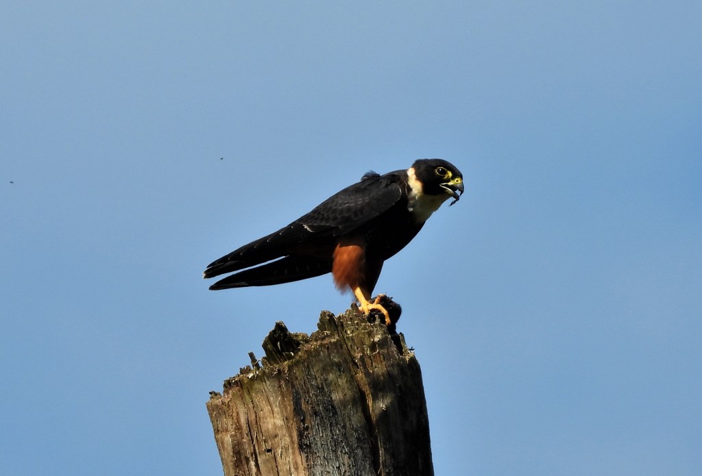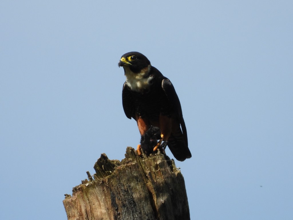 Identification of this species is not usually a problem, except perhaps if seen only in flight, when it might suggest a Swift. With white throat and rufous underparts the Bat Falcon is a real beauty. The rufous ‘leggings’ are also seen to good effect in Sean’s final photograph:
