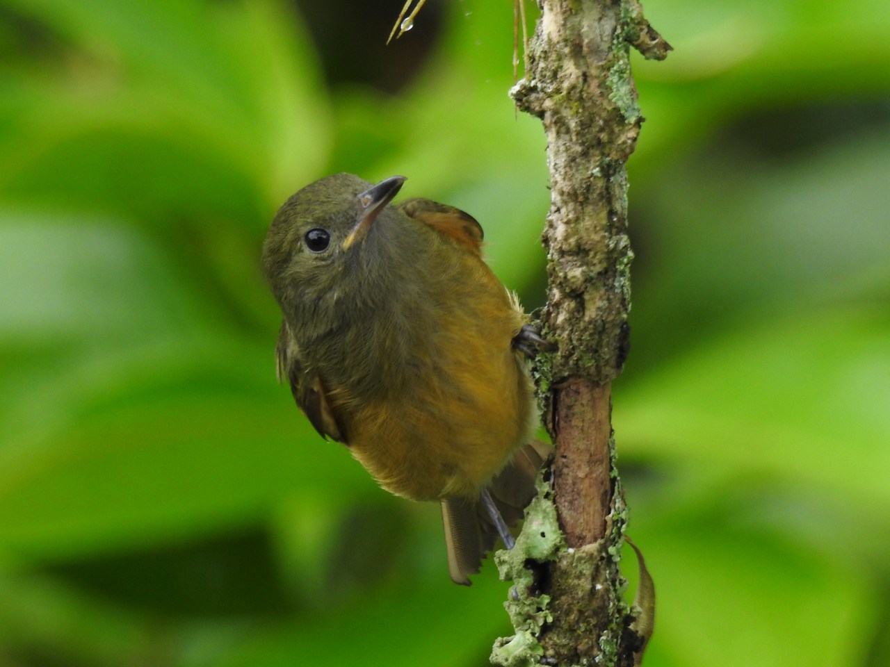 The Ochre-bellied Flycatcher is a uniformly dull-plumaged bird, lacking any white on head, wings or belly. This detail helps to distinguish it from other flycatchers that occupy similar habitats, such as the Slaty-capped Flycatcher (Leptopogon superciliaris), among others. The next photo, from the back, illustrates just how difficult identification can be at times, even when the bird is clearly seen: