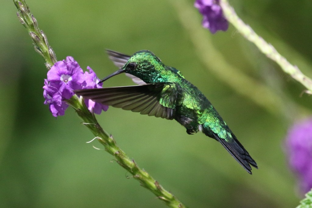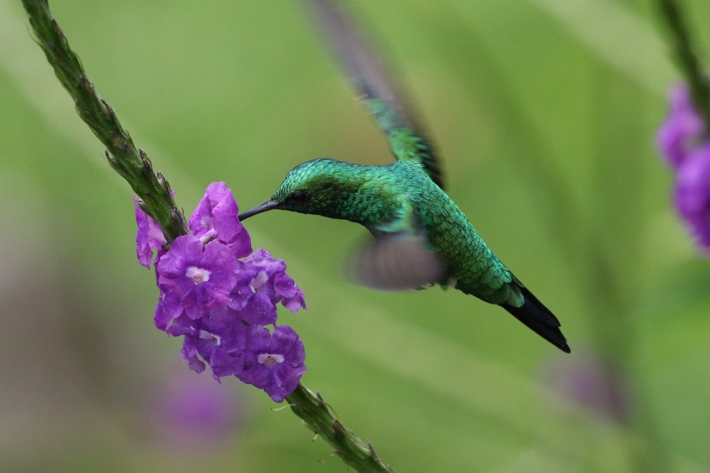It is a lowland hummer that despite the many local reports managed to escape me in my first years in Turrialba. It is found only in Costa Rica and Panama – indeed, its French name translates to ‘Panama Emerald’. My initial encounters with it came thanks to local guide Steven Aguilar, who regularly finds it at a rabo de gato hedge near San Rafael de Pavones on the Turrialba-Siquirres road. Known as porterweed in English, this plant, which is found country-wide, is a great favourite with hummingbirds and other small nectar-seekers such as the Bananaquit (Coereba flaviola).