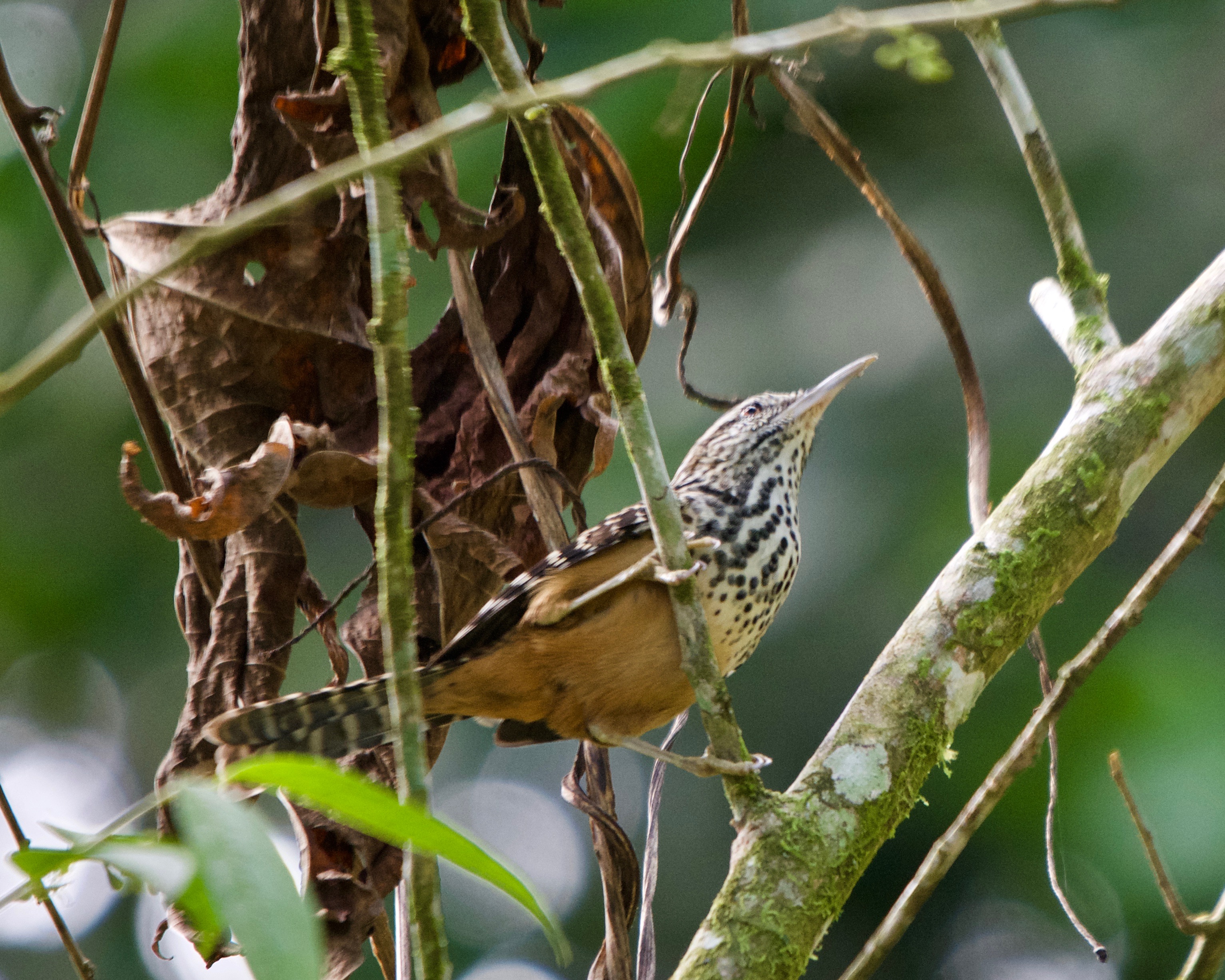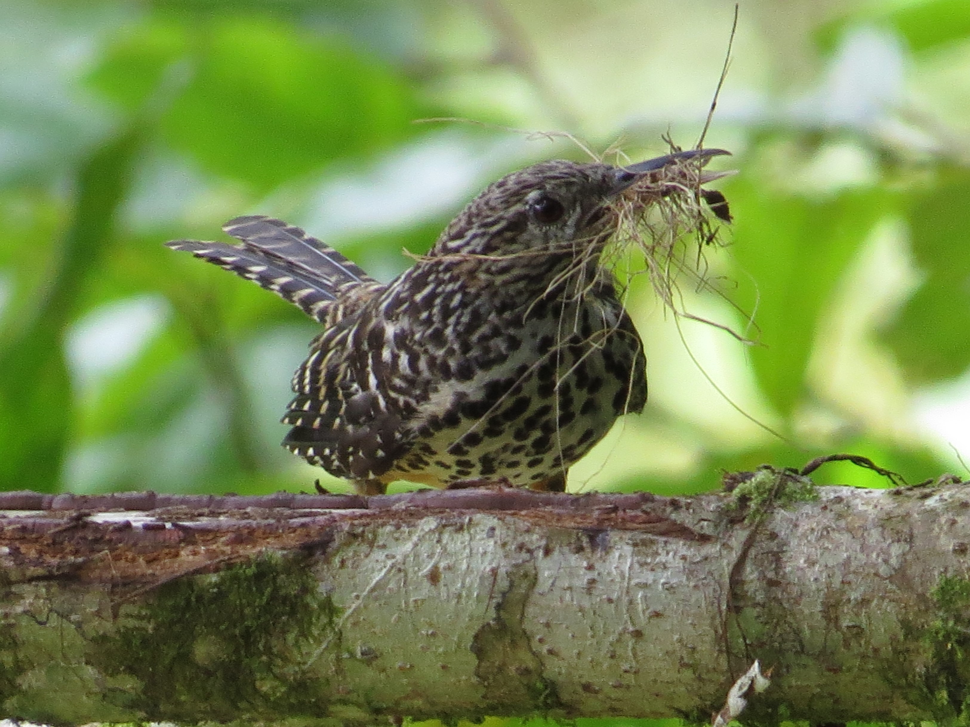 Seems to be all spots: Band-backed Wren with nesting material at Siquirres; photo by John Beer