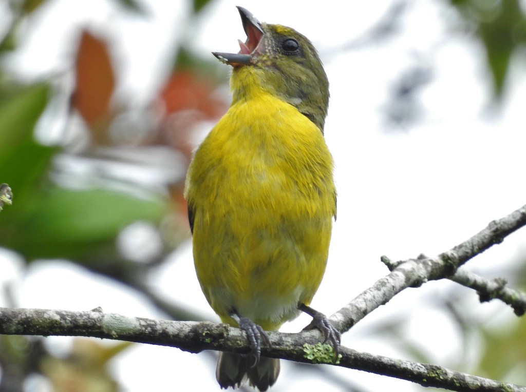 Here’s a close-up shot of a female. She sings just as loudly, though less sweetly, than the male. Female euphonias are not always easy to identify. On this species look for the grey-white lower belly, which is unfortunately often quite difficult to spot: